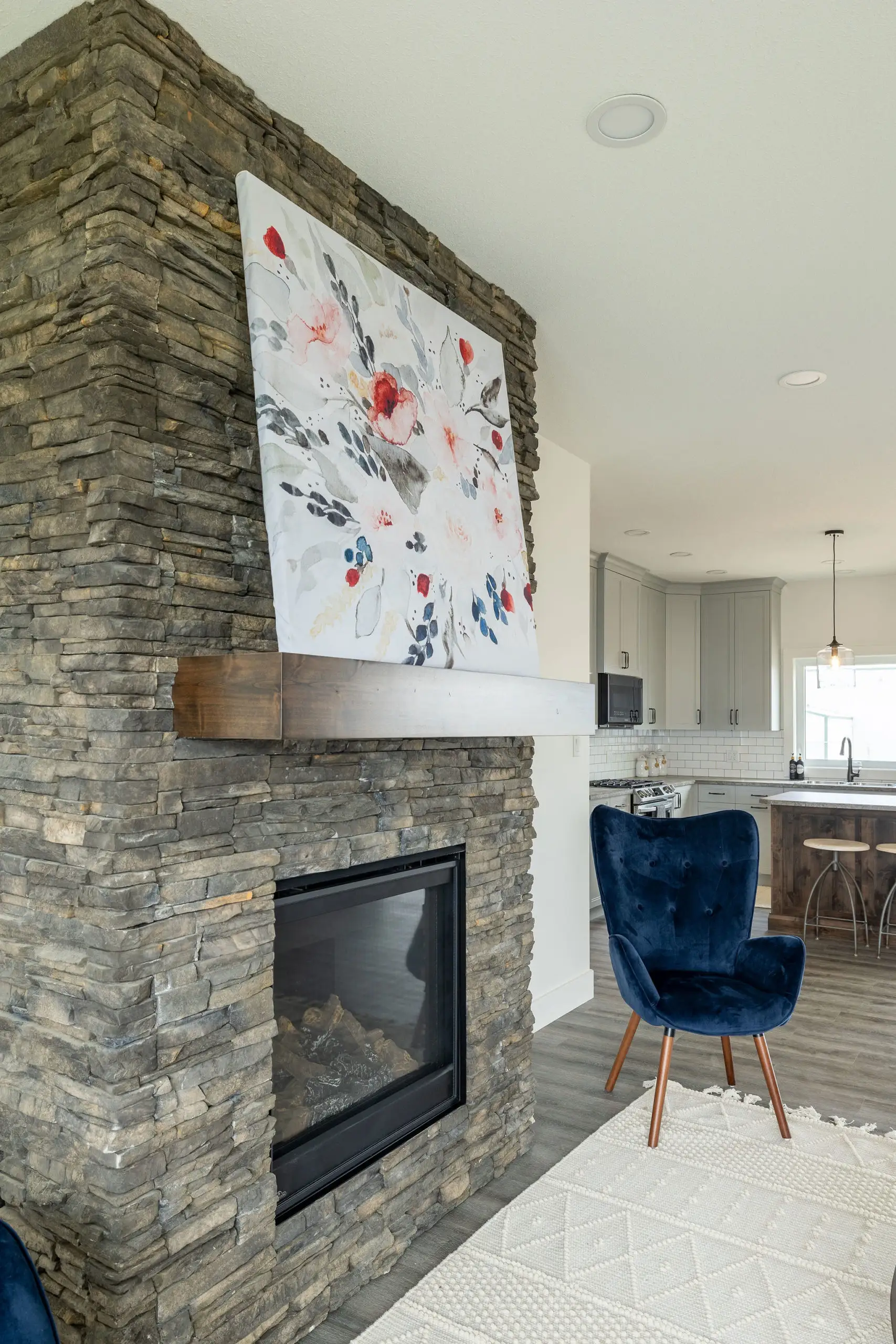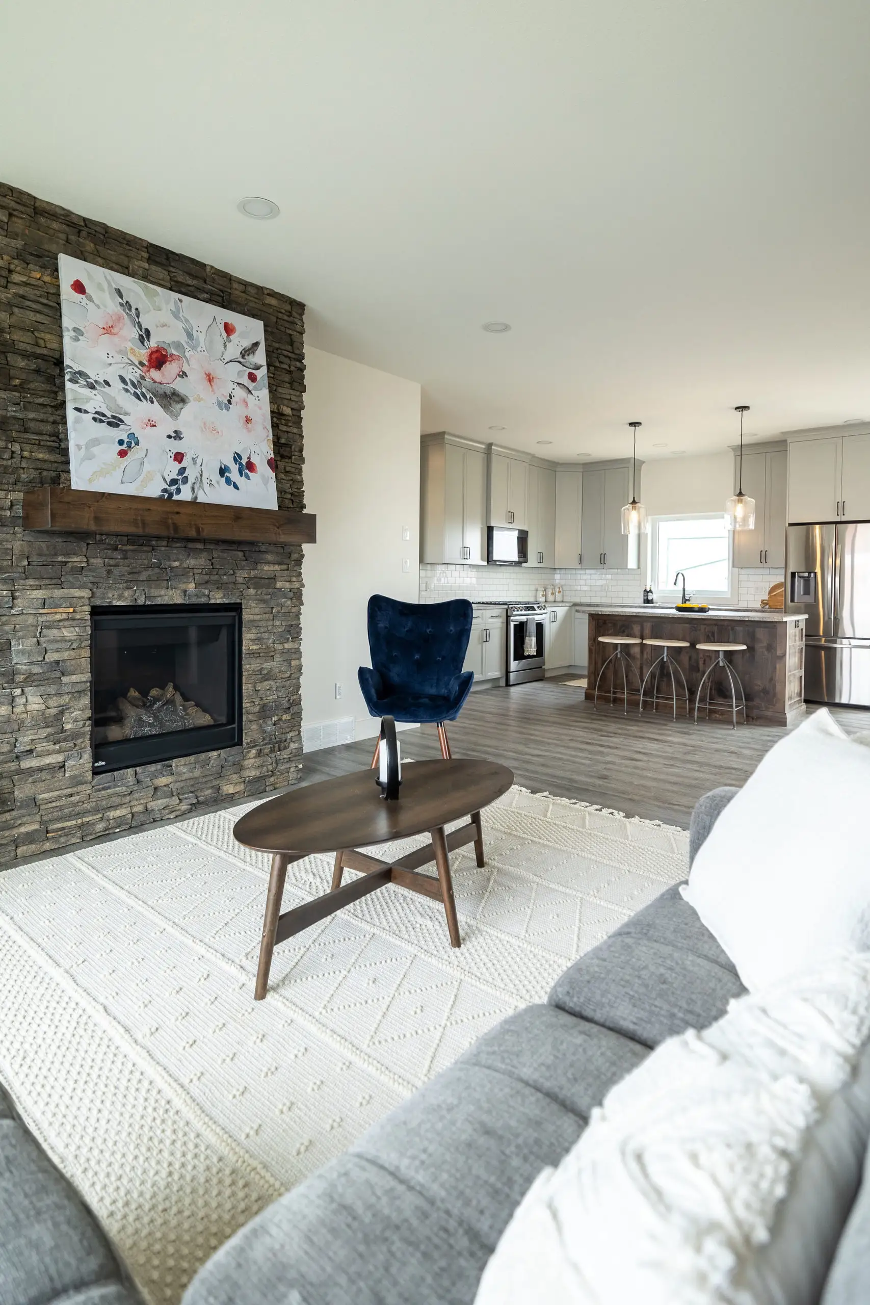 A very attractive custom made starter home. Impressive features include gas fireplace and attractive rock work.